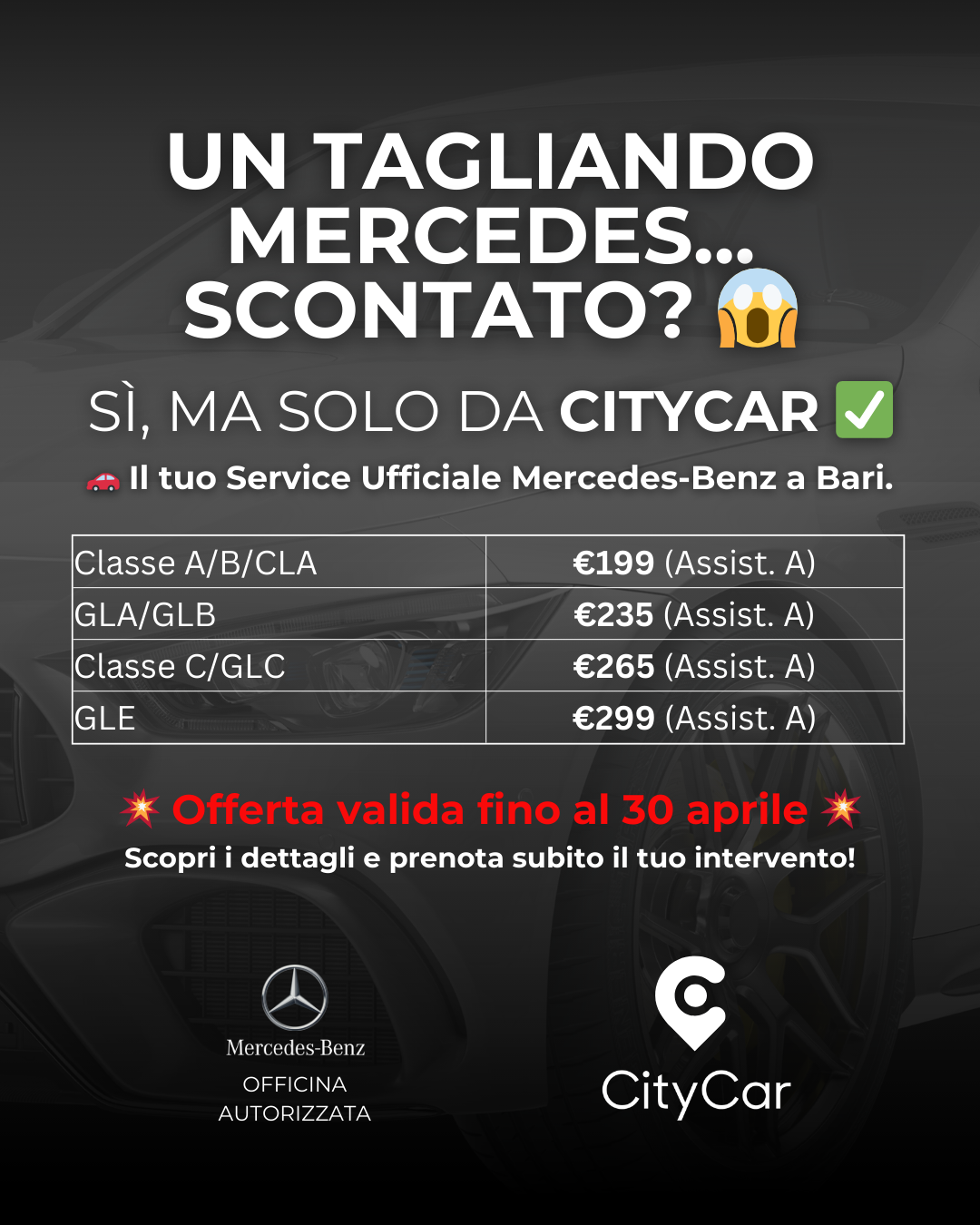 Affida la tua auto a Citycar, service ufficiale Mercedes-Benz e smart a Bari. Offriamo assistenza completa per garantire sicurezza, prestazioni e longevità al tuo veicolo. Dal tagliando alla carrozzeria, dai cristalli agli pneumatici: la tua auto è in mani esperte. Prenota ora il tuo intervento e guida senza pensieri!